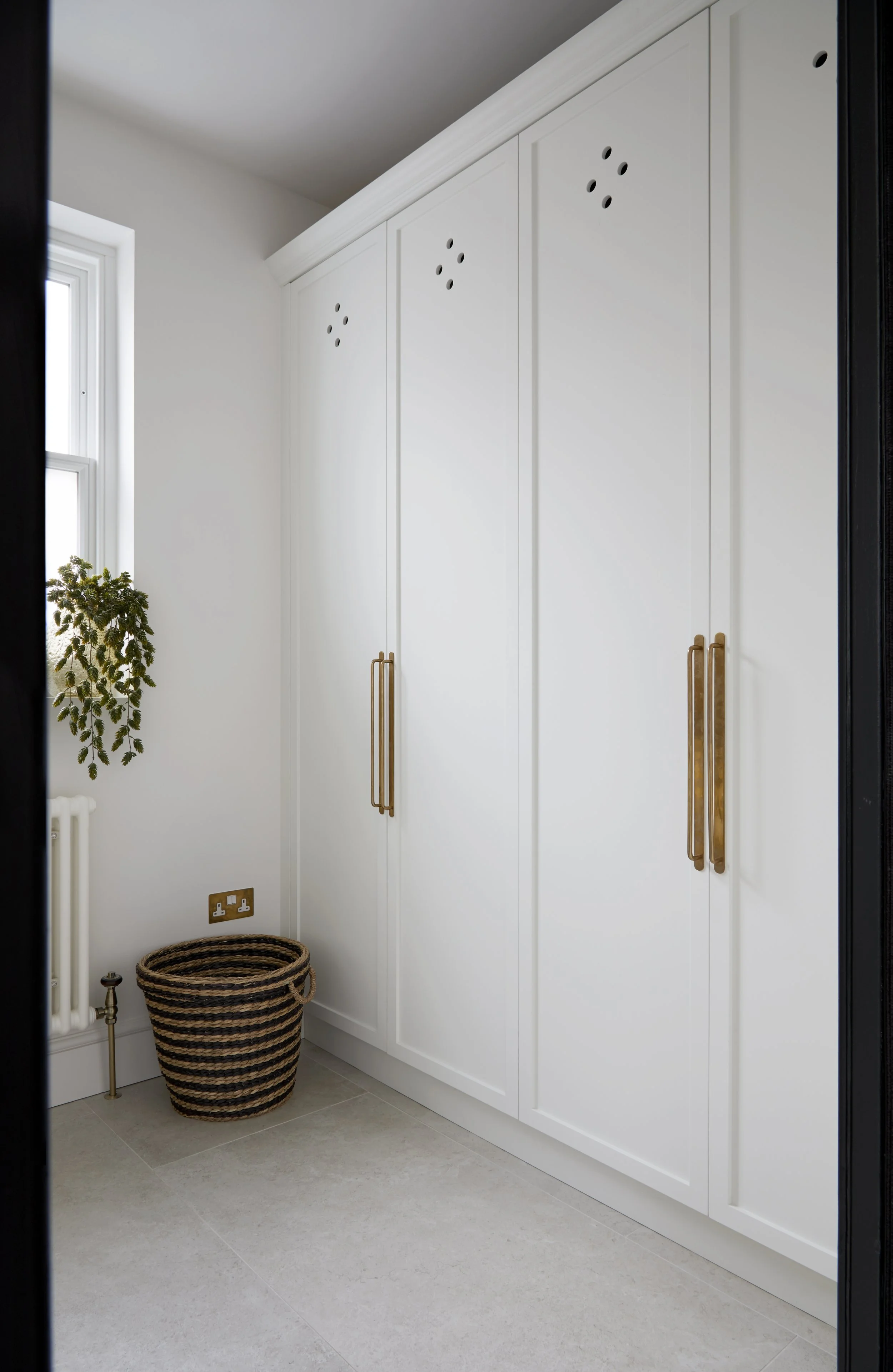 The kitchen's footprint was retained, but a wall was knocked out to create a feeling of space. We collaborated with our clients and a bespoke joinery company to develop the kitchen and utility cabinets along with a large bookshelf and fitted wardrobe complete with a floating dressing table in the master bedroom.